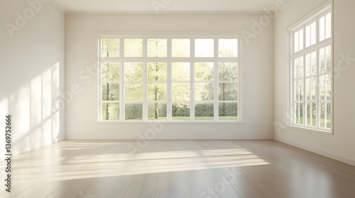 Bright Empty Room with Large Windows and Sunlight Streaming In Modern Minimalist Interior Design