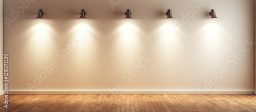 Bright empty white wall illuminated by five spotlights casts soft shadows on warm wooden floor creating a spacious minimalist interior ambiance.