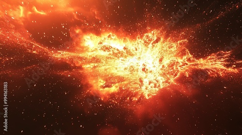 Bright explosion of fiery colors in a cosmic space, showcasing bursts of energy and particles against a starry backdrop