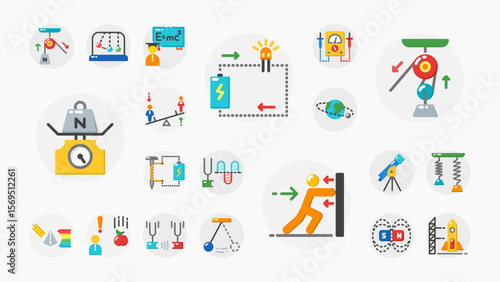 Bright flat-style icons featuring physics concepts, motion, energy, force, electricity, experiment tools, and educational science visuals.