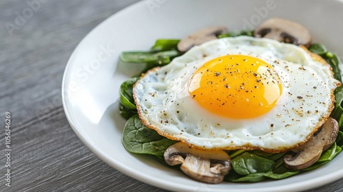 Bright Fried Egg with Creamy Yolk on Fresh Spinach