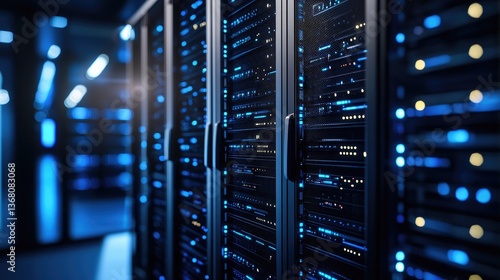 Bright, futuristic data center with glowing server racks and cool blue lighting, representing advanced computing technology. Perfect for IT, cloud, or cybersecurity themes