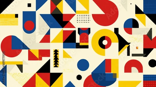 Bright geometric pattern of red, yellow, and blue shapes over a cream background