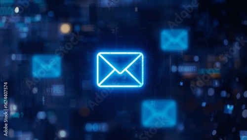 Bright glowing email icon displayed upon the futuristic digital network background, symbolizing online communication, data exchange, and technology within a modern virtual space