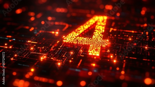 Bright glowing number four surrounded by digital patterns and lights in a futuristic landscape