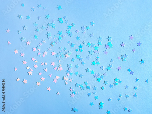 Bright gold stars on a blue background with sequins. The concept of a holiday, joy. Festive background for your projects