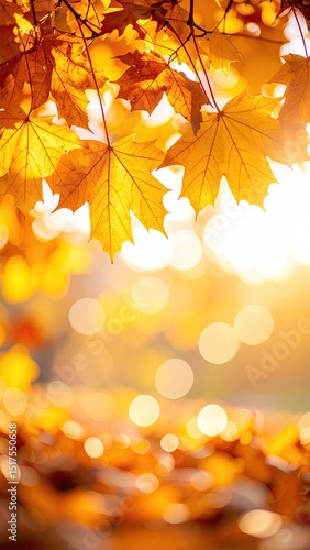 Bright golden autumn leaves illuminated by sunlight against a blurred background of warm fall colors
