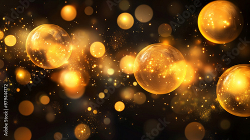 Bright golden light orbs gently floating against a deep black background, creating a warm, magical atmosphere.