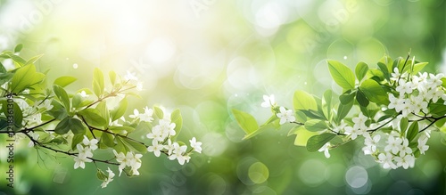 Bright green foliage with blurred white flowers creates a serene bokeh background illuminated by sunlight on the left and right sides.