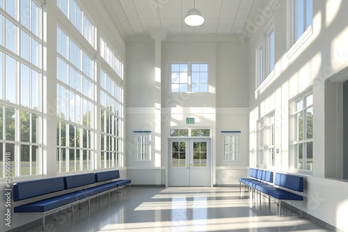 Bright Hallway with Sunlit Windows, Modern Benches, and Exit Door. Spacious Interior Design with Natural Light.