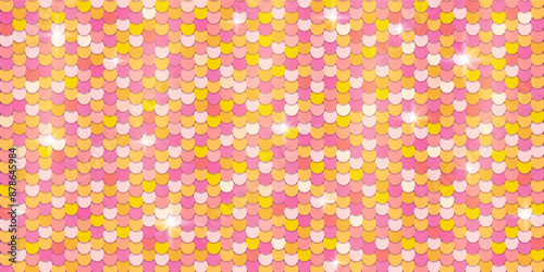 Bright horizontal background with metallic sequins in yellow, pink, peach and orange. Scale texture, fabric imitation, textile