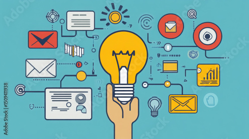 Bright Ideas: Hand Holding Light Bulb with Digital Marketing and Technology Icons on Blue Network Background