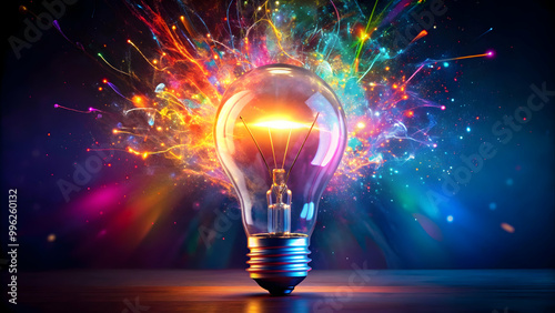Bright light bulb surrounded by colorful sparks of inspiration, creativity, innovation, ideas, imagination, brainstorming