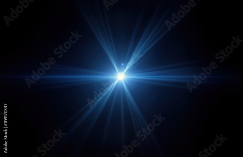 Bright light rays radiate outward from center. Dark background. Abstract light effect. Light flares. Digital graphic design. Photo for tech. Lens effect. Light source. Photo for web design. Ideal for