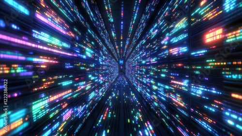 Bright lights create a vibrant digital tunnel effect showcasing data movement through space