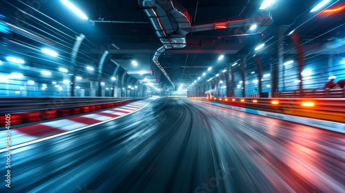 Bright lights illuminate the indoor racetrack as cars speed around the bend in a thrilling nighttime racing event, capturing the excitement of motorsport fans nearby in a modern facility.