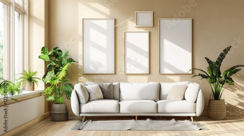 Bright living space with couch, window, indoor plants, and empty frames on tan wall