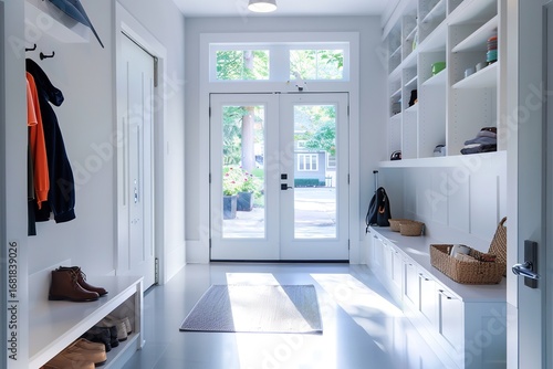 Bright Mudroom with White Built-Ins, Natural Light, and Coat Rack for Organized Home Entryway