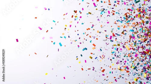 Bright multicolored confetti scattered on white background.