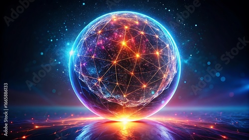 Bright neon 3d sphere in the space. Glowing particle 3d energy orb. Abstract technology, science, neural networks, and artificial intelligence. Virtual assistant concept.