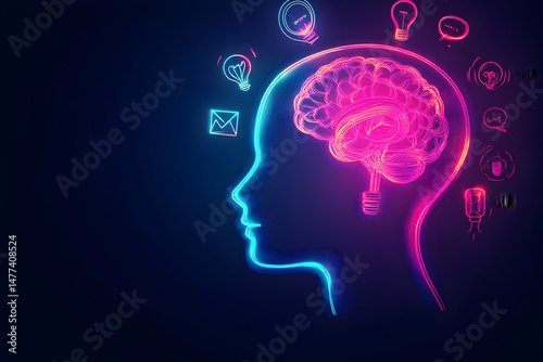 Bright Neon Brain Illustration with Ideas and Concepts Visualization