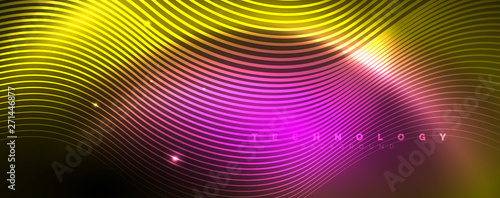 Bright neon circles and wave lines, glowing shiny background design template, digital techno concept.
