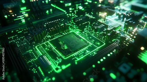 Bright neon green data streams in a motherboard circuit, creating a futuristic internet and network technology wallpaper. Futuristic Neon Circuit. Illustration
