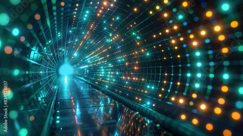 Bright neon tunnel with green and blue lights, emphasizing the concepts of highspeed internet and data transmission
