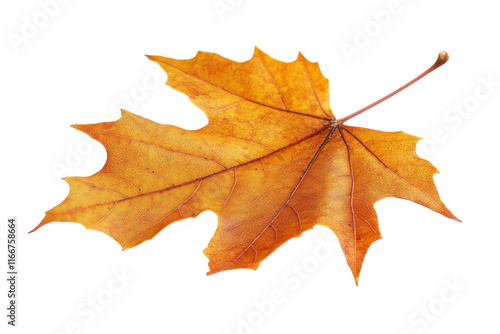 Bright orange autumn leaf resting on a white background highlighting its detailed texture and shape