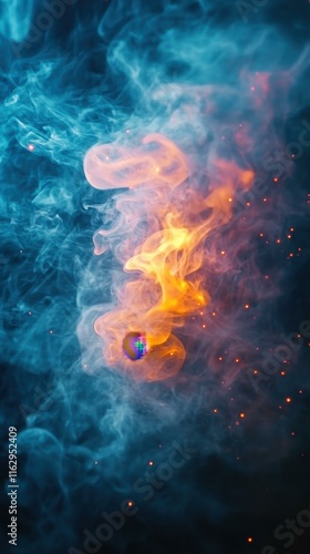 Bright orange fire flame swirling with blue thick smoke, glowing sparks flying around, abstract background for technology themes, energy concepts, dynamic motion with dark contrast colors