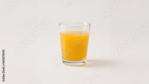 Bright orange juice displayed in a glass with a plain white background