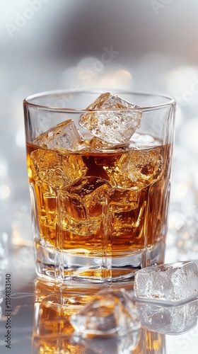 Bright orange juice fills a transparent glass, adorned with ice cubes, resting on a gleaming surface reflecting warm sunlight. Ideal for a summer day