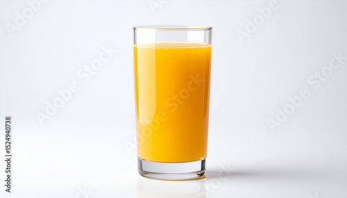 Bright orange juice in clear glass with condensation, front view, vibrant studio lighting, solid white background