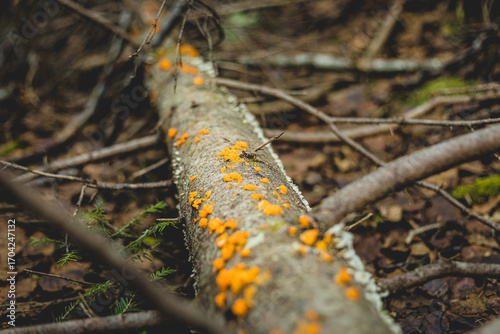 Bright orange lichen grows on a fallen log in a dense forest surrounded by fallen leaves and branches