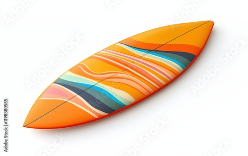 Bright orange surfboard with colorful wave patterns, standing on a clean white background