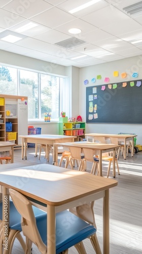 Bright, organized classroom with tables, chairs, and educational materials for learning.