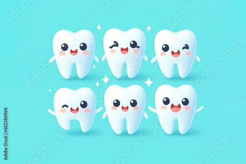 bright picture of white cute funny smiling tooth characters with faces isolated on blue color background. ai generative