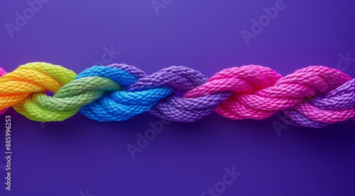 Bright pink, lime green, lilac and blue colorful strings connected together on a dark purple gradient background, representing the concept of unity and collaboration with copy space area for text.