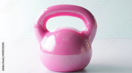 Bright pink shiny kettlebell standing alone on a smooth white surface with soft lighting and minimalistic background