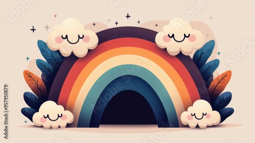 Bright rainbow with smiling clouds, joyful scene, flat design illustration