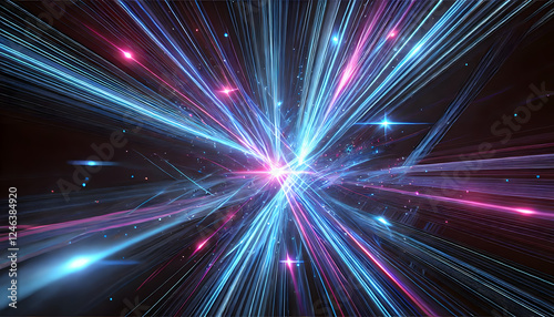 Bright rays of blue and pink light radiating from a central explosion, creating a futuristic and energetic visual effect..