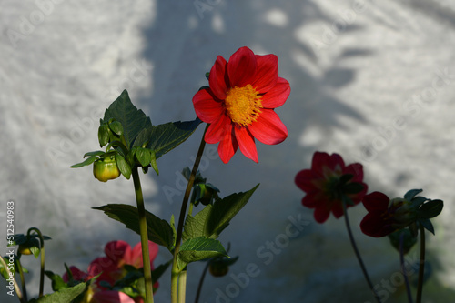 Bright red flower of dahlia in summer. Flower bed on the background of greenhouse in the garden