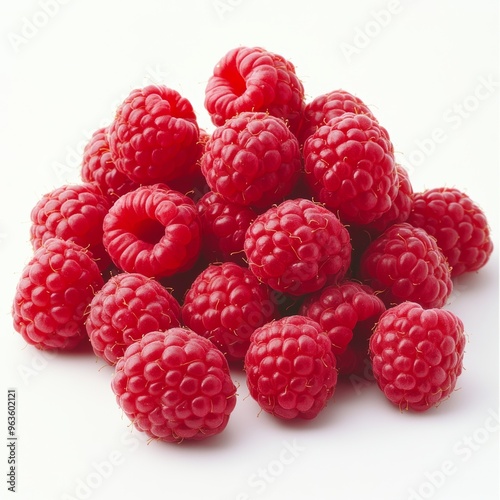 Bright red raspberries arranged in a neat pile, glistening against a plain white background