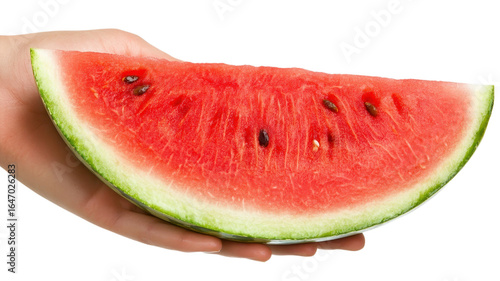 Bright red watermelon slice showcases juicy texture as it is held, perfect for a refreshing summer snack