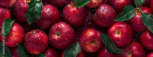 bright ripe red apples with leaves and closeup top view, fragrant apples with water drops and background patterns