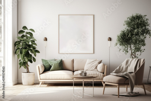Bright Scandinavian Living Room with Blank Horizontal Poster Frame and Natural Decor