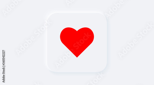Bright white gradient square button with red heart shape. Internet symbol like on a background. Neumorphic effect icon. Shaped love figure in trendy soft 3D style