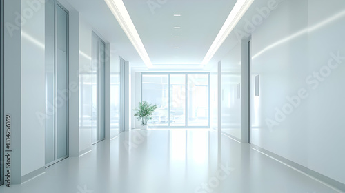 Bright White Modern Hallway With Glass Door And Potted Plant In Minimalist Office Building Interior Design