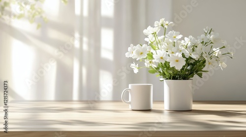 Bright white wooden table adorned with a white flower arrangement and a white coffee cup in soft natural light at a cozy indoor setting.