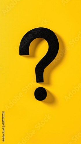 Bright yellow background features three-dimensional black question mark. Image evokes business concept idea. Suggests need for solutions assistance. Concept of seeking answers finding solutions clear.